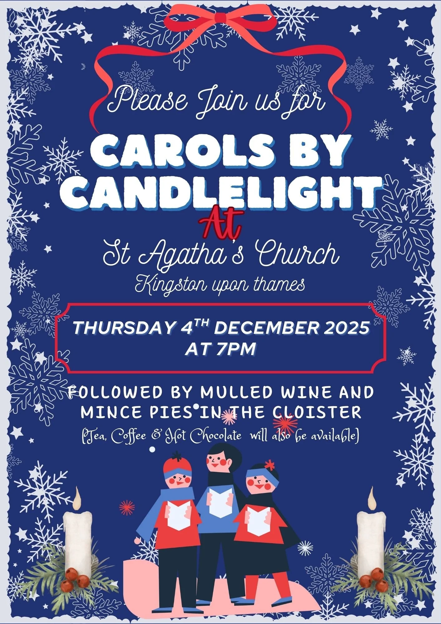 Please join us on Thursday 4th December 2025, at 7pm, for our ‘Carols by Candlelight’ service. A full lineup of Carols will be sung, followed by mulled wine, hot chocolate and mince pies served in the Cloister!